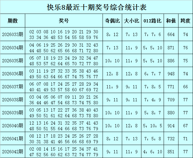 福彩快乐8第2026042期开出奖号:02 08 14 15 16 17 25 34 37 41 47 52 56 60 62 63 72 74 77 79,其中奖号奇偶比开出9:11,大小比开出11:9,和值开出851,跨度开出77,012路比开出4:6:10。