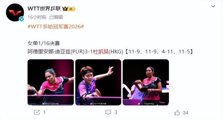 2026年WTT多哈冠军赛女单首轮,杜凯琹输给波多黎各选手,阿德里安娜・迪亚兹。