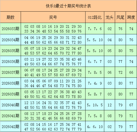 快乐8第2026042期奖号为:02 08 14 15 16 17 25 34 37 41 47 52 56 60 62 63 72 74 77 79,其中奖号012路比为4:6:10,0路号码(4个):15、60、63、72,1路号码(6个):16、25、34、37、52、79,2路号码(10个):02、08、14、17、41、47、56、62、74、77。