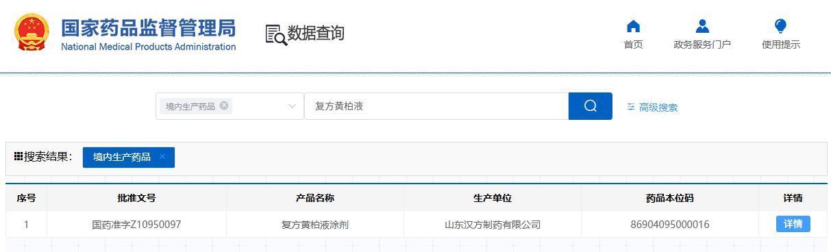 据国家药监局数据显示,复方黄柏液全称为复方黄柏液涂剂,独家生产单位为山东汉方制药有限公司(简称“汉方制药”)。